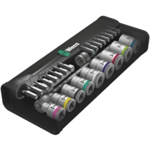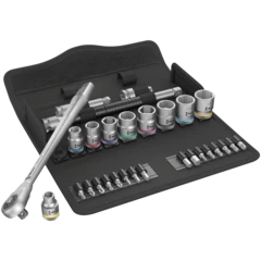 Incredibly compact set arrangement with many tools in a minimum of space. A completely new ratchet set feeling thanks to the unique textile boxes that are very robust and durable. They can be positioned upright for tidy storage on the workshop shelf. Additional surface protection due to textile outer material. Low weight and volume for simpler mobility. Take it easy Tool Finder with colour coding according to sizes.