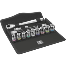 Incredibly compact set arrangement with many tools in a minimum of space. A completely new ratchet set feeling thanks to the unique textile boxes that are very robust and durable. They can be positioned upright for tidy storage on the workshop shelf. Additional surface protection due to textile outer material. Low weight and volume for simpler mobility. Take it easy Tool Finder with colour coding according to sizes.