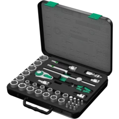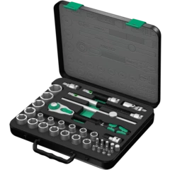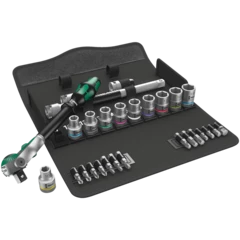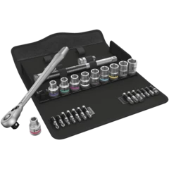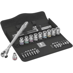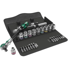 Incredibly compact set arrangement with many tools in a minimum of space. A completely new ratchet set feeling thanks to the unique textile boxes that are very robust and durable. They can be positioned upright for tidy storage on the workshop shelf. Additional surface protection due to textile outer material. Low weight and volume for simpler mobility. Take it easy Tool Finder with colour coding according to sizes.