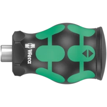 Particularly small bit hand-holder with short bit mounting for hard to reach areas. The strong permanent magnet in the bit mounting ensures secure holding of the bit. The 2-component handle with the practical combination of hard and soft zones allows for a firm grip and precise working.