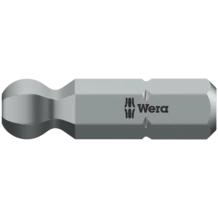 Tough Wera bits for hexagonal socket screws, for universal use. The ball-shaped tip profiles enable the tool shaft to be moved and pivoted relative to the screw axis which allows screwdriving "around the corner". 1/4" hexagonal, suitable for holding tools as per DIN ISO 1173-D 6.3.