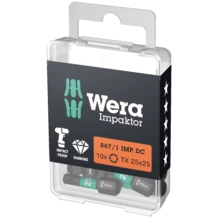 High quality bits for recessed TORX® screws. The Impaktor technology offers an above-average service life even under extreme circumstances. Enhanced friction resistance, thanks to the rough diamond-particle coating on the bit tip, prevents any slipping out of the screw head. Particularly suitable for use with customary impact drivers. ¼" hexagon, suitable for holders as per DIN ISO 1173-D 6.3.