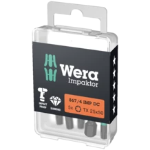High quality bits for recessed TORX® screws. The Impaktor technology offers an above-average service life even under extreme circumstances. Enhanced friction resistance, thanks to the rough diamond-particle coating on the bit tip, prevents any slipping out of the screw head. Particularly suitable for use with customary impact drivers. ¼" hexagon, suitable for holders as per DIN ISO 1173-F 6.3.