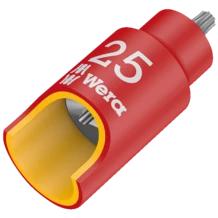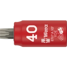 VDE 1/4" bit socket with holding function for TORX® screws for particularly comfortable screwdriving thanks to a reduced risk of losing the screw when feeding it into the workpiece. With increased safety thanks to the yellow insulation core, which becomes visible if the outer red VDE insulation layer is damaged. Individually tested tools as per IEC 60900 at 10,000 V for safe working at the approved voltage of 1,000 V.