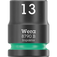 Impaktor socket wrench insert for use with electric or pneumatic wrenches with 3/8" drive. The Impaktor technology ensures a higher-than-average service life even at extreme requirements. With Take it easy Tool finder with colour coding by size - for quick and easy identification of the required tool. With hexagon profile and socket with hole. The hexagon profile offers the transmission of high forces and loads the edges of the bolt or the screw head less than a double hexagon profile. For external hexagon bolts and screws.