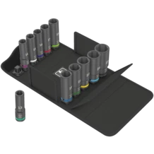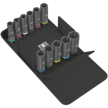 Set with 11 Impaktor Deep sockets for use with electric or pneumatic wrenches with 12.5 mm = 1/2" drive. Long design for low-lying couplings and protruding thread rods. The Impaktor technology ensures a higher-than-average service life even at extreme requirements. The hexagon profile used allows a high power transmission while simultaneously being precise and protecting the profile. With Take it easy tool finder with colour coding by size - for quick and easy identification of the required tool .