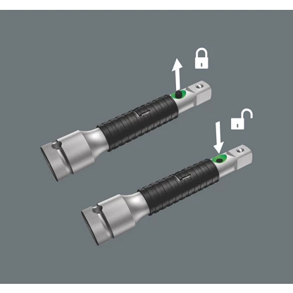 Wera Zyklop extension with flexible-lock: when activated the sockets are secured and permanently fixed, any unintentional loss being avoided. When the system is deactivated, the sockets can be quickly attached and exchanged. Equipped with a free-turning sleeve for faster turning of screws and nuts.
