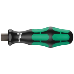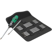 11-piece Vario set with handle and blades. In a practical belt pouch, enabling the tools to be safely and securely stored and to always be at hand. The Kraftform grip on the handle stands for pleasant, ergonomic working and makes blisters and calluses a thing of the past. Hard gripping zones for high working speeds whereas soft zones ensure high torque transfer. The hexagonal non-roll feature prevents any annoying rolling away at the workplace. The integrated hex bolster allows higher torque to be applied with an open-end or ring spanner. The double blades are out of high quality bit material and are therefore particularly durable. The Wera Black Point tip on the blade offers a perfect fit and optimised corrosion protection.