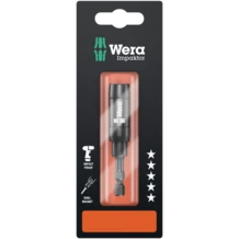 Wera Impaktor holder for the absorption of extreme impulse peaks. Special torsion effect thanks to the double-torsion spring. The Impaktor holder additionally holds long and heavy screws absolutely securely. This enables a rapid and dependable positioning of the screw. Ideal also for overhead work. Should, situation-related, the magnet not be desired e.g. when working with metal, it can be removed from the screwdriving zone and thereby be neutralised. Used mostly for manual power tool applications. Output: suitable for bits with ¼" hexagon head drive as per DIN ISO 1173-C 6.3. Drive: ¼" hexagon, suitable for power screwdrivers with take-up as per DIN ISO 1173-F 6.3.