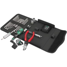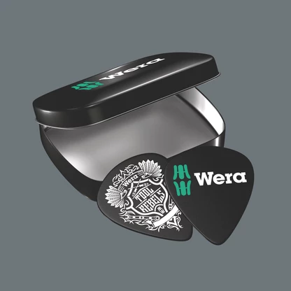 Guitar tool set: The set contains all the tools necessary for adjustment and maintenance repair work. Wera stainless steel angle wrench with Hex-Plus profile (sizes: 1.5, 2.0, 2.5, 5.0 and in the inch sizes 1/8", 5/32", 3/16"). Wera 89 mm long stainless steel bits for hexagon socket screws (sizes: 1.5, 2.0, 2.5), Kraftform handle for 1/4" bits, 1/4" stainless steel bits for slot (sizes: 1.8x 12x41 mm, 0.6x3.5x89 mm, 1.2x8.0x89 mm), Phillips screws (sizes: PH 1x89 mm, PH 2x89 mm) and hexagon socket screws (size: 0.05"x25 mm), Wera adapter for handle (1/4" hex socket of the handle on 1/4" square of sockets), Wera Zyklop sockets (sizes 10 and 1/2"), string crank with 1/4" hex for use in the handle, KNIPEX® string cutter, feeler gauge, input jacker, 2 picks.
