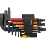 High quality Wera L-keys with colour coded, convenient plastic sleeve. This means that the tool is quickly accessible and the ergonomic and pleasant handle is easy on the hands even at low temperatures. Hex-Plus L-keys provide larger contact surfaces on the screw head. The notching effect is thereby reduced to a minimum; the destruction of the screw head is almost eliminated. The ball on the long arm allows safe working even in difficult mounting positions. The BlackLaser surface treatment provides excellent surface protection, corrosion resistance and long life. Laser coated abrasion-resistant size markings on the L-keys for quick access.