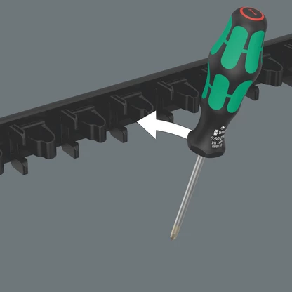The high-quality aluminium magnetic rail offers space for up to 9 Kraftform screwdrivers. The clamping springs hold the tools securely.