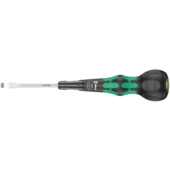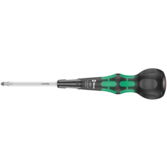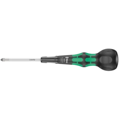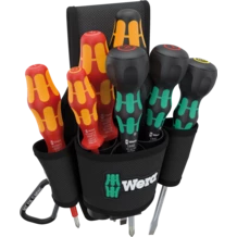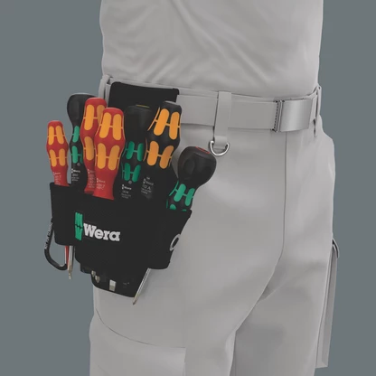Kraftform Plus handle for comfortable ergonomic screwdriving, avoiding blisters and calluses. Hard handle zones for high working speeds, while soft handle zones guarantee a high torque transfer. Includes some tools with Lasertip: The tips of Wera Lasertip screwdrivers are microscopically roughened with laser beams. This rough surface "bites" into the screw head and unintentional slipping is a thing of the past. Take it easy tool finder with colour coding by profile and size stamping - for quick and easy identification of the required tool.