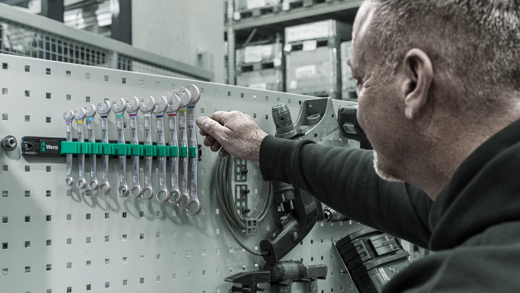 The Joker 6000 ring ratchet spanner with holding function for hexagon screw heads and bolts. With its extra hard teeth, the exchangeable metal plate in the open end secures screws and sockets. The integrated end stop can prevent the screw head from slipping down and allows application of high torques. The double hexagon geometry ensures a positive connection with the screw or bolt and thus reduces the risk of slipping. A return angle of only 30° at the open end avoids time-consuming rotating of the wrench whilst screwdriving. Ratchet mechanism at the ring side with exceptionally high fine toothing of 80 teeth for flexibility even in confined spaces. The specially engineered geometry allows high torque transmission and high bending stiffness. Made of high-performance chromium molybdenum steel with nickel-chromium coating for high corrosion protection. With Take it easy Tool finder: Colour coding by size. The clips hold the tools perfectly. With its strong magnet, the rail holds securely to metal surfaces. It can also be bolted to the wall.