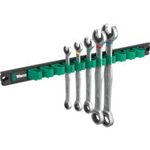Ring ratchet spanner set, 5-piece set, metric sizes; on a magnetic rail. The Joker 6000 ring ratchet spanner with holding function for hexagon screw heads and bolts. With its extra hard teeth, the exchangeable metal plate in the open end secures screws and sockets. The integrated end stop can prevent the screw head from slipping down and allows application of high torques. The double hexagon geometry ensures a positive connection with the screw or bolt and thus reduces the risk of slipping. A return angle of only 30° at the open end avoids time-consuming rotating of the wrench whilst screwdriving. Ratchet mechanism at the ring side with exceptionally high fine toothing of 80 teeth for flexibility even in confined spaces. The specially engineered geometry allows high torque transmission and high bending stiffness. Made of high-performance chromium molybdenum steel with nickel-chromium coating for high corrosion protection. With Take it easy Tool finder: Colour coding by size. The clips hold the tools perfectly. With its strong magnet, the rail holds securely to metal surfaces. It can also be bolted to the wall.