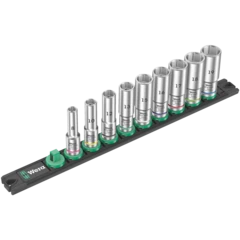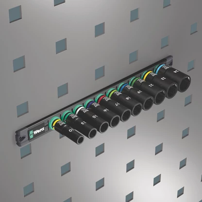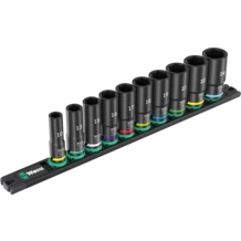 Socket rail with 10 long Impaktor sockets, 3/8". The Impaktor technology ensures higher-than-average service life even at extreme requirements. Long design to work even on low-lying couplings and protruding thread rods. The hexagon profile offers the transmission of high forces and loads the edges of the bolt or the screw head less than a double hexagon profile. With Take it easy tool finder with colour coding by size - for quick and easy identification of the required tool. The rail allows temporary attachment to metallic surfaces and, with its twist-to-unlock function, ensures secure locking and unlocking of the sockets.