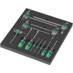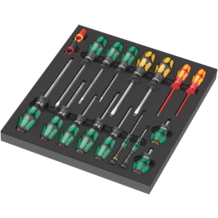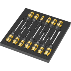 • 8 Kraftform Plus screwdrivers with hard zones for high working speeds and soft handle zones for a high torque transfer