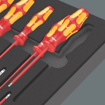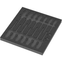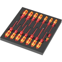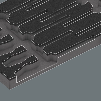 Durable foam insert; two-coloured for quick identification of missing parts; suitable for the Tool Rebel roller cabinet, equipped with 14 Wera Kraftform VDE screwdrivers as well as two screw grippers.