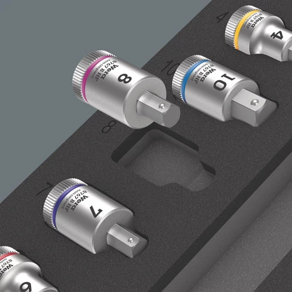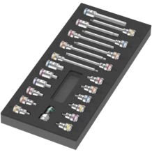 Durable foam insert; two-coloured for quick identification of missing parts; suitable for the Tool Rebel roller cabinet; equipped with 21 Wera bit sockets, 3/8" and one Zyklop connector with quick-release chuck for ¼" bits.