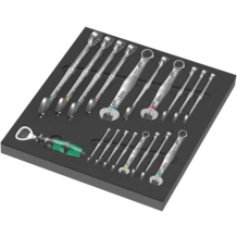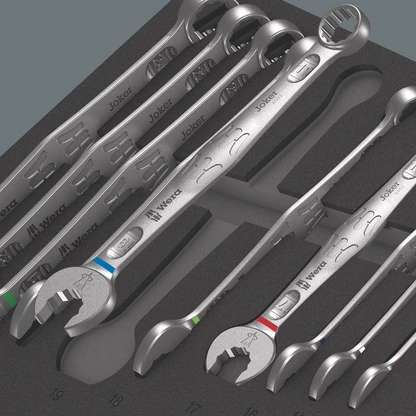 Durable foam insert; two-coloured for quick identification of missing parts; suitable for the Tool Rebel roller cabinet; equipped with 18 Wera 6003 Joker ring spanners and one Wera Kraftform bottle opener.