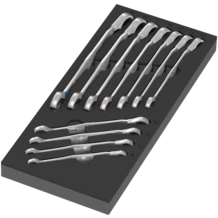 Durable foam insert; two-coloured for quick identification of missing parts; suitable for the Tool Rebel roller cabinet. Equipped with 11 reversible Joker Switch 6001 ring ratchet spanners.
