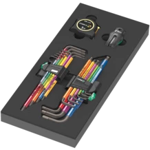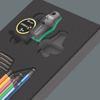 Durable foam insert; two-coloured for quick identification of missing parts; suitable for the Tool Rebel roller cabinet; equipped with 9-piece Wera L-key set 950/9 Hex-Plus Multicolour 1 for hexagonal socket screws, 9-piece Wera L-key set 967/9 TX XL Multicolour 1 for TORX® screws, one 9500 magnet, one Stabila pocket tape measure (3 m).