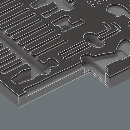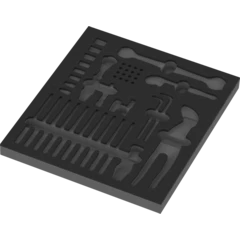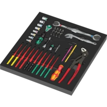 Durable foam insert; two-coloured for quick identification of missing parts; suitable for the Tool Rebel roller cabinets, equipped with one Kraftform Kompakt VDE 817 VDE handle and 10 blades for the following screw profiles: Phillips, Pozidriv, TORX®, hexagonal socket and slotted, one Zyklop Speed ratchet (1/4"), 8 sockets (1/4"), 1 extension (1/4", 50 mm long), one adapter (1/4" square head to 1/4" hexagon) for 1/4" bits, one universal holder for screwdriving machines for 1/4" bits, 16 bits (25 mm long) for the following screw profiles: Phillips, Pozidriv, TORX®, hexagonal socket and slotted; 2 L-keys with holding function for hexagonal socket screws (sizes 3.0 and 4.0), one Joker 6002 double open-end wrench (sizes 17 and 19), one 6004 Joker S self-setting wrench for hexagon screw heads and bolts with wrench sizes 10.0; 11.0; 12.0; 13.0 (metric) or 7/16"; 1/2" (imperial), one KNIPEX Cobra® 87 01 250 high-tech water pump pliers.