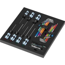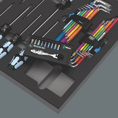 Durable foam insert; two-coloured for quick identification of missing parts; suitable for the Tool Rebel roller cabinets; equipped with Wera stainless steel tools: 6 Kraftform screwdrivers (Phillips, TORX®, slotted), Bicycle Set 9 with Zyklop Mini bit ratchet and 9 bits (Phillips-head, TORX®, hexagonal socket; 25 mm long), L-key set (9-piece set) with holding function for hexagonal socket screws, L-key set (9-piece set) with holding function for TORX® screws.