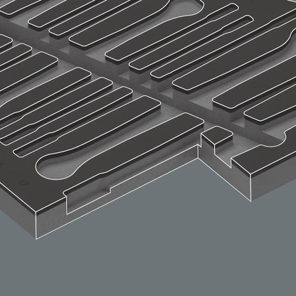One durable foam insert, without tools; two-coloured for quick identification of missing parts; width x height x depth: 172 x 30 x 392 mm; spare foam insert for Wera item 9735; suitable for the Tool Rebel roller cabinets.