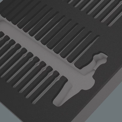 One durable foam insert, without tools; two-coloured for quick identification of missing parts; width x height x depth: 344 x 30 x 392 mm; spare foam insert for Wera item 9710; suitable for the Tool Rebel roller cabinet.