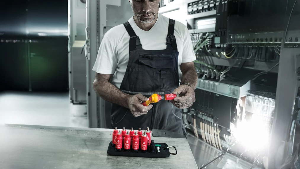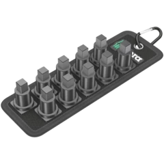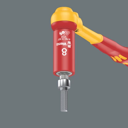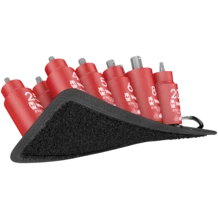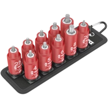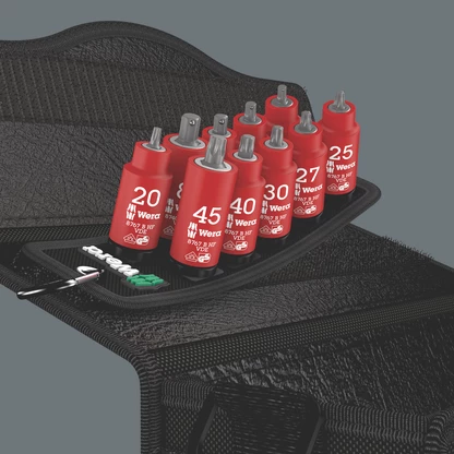 10 Zyklop bit sockets, with ⅜" drive, insulated, individually tested as per IEC 60900. Increased safety due to 2-component isolation with yellow core under red insulation outer layer visible in case of damage to outer red VDE insulation layer. With holding function for TORX® screws to Acument Intellectual Properties specifications or holding function for hexagonal socket screws. Robust textile belt in the typical Wera design with 10 VDE bit sockets in a compact space. A smooth turning mechanism ensures secure holding and easy removal of the sockets. Includes snap hook for attaching to belt loops or bags. With fleece backing and hook and loop fastener strips for easy attachment e.g. on wall, shelf, workshop trolley and Wera 2go tool transport system. VDE ⅜" bit socket and holding function for particularly comfortable screwdriving with reduced risk of screw loss when feeding to the component. With increased safety due to yellow insulation core, which becomes visible in case of damage to the outer red VDE insulation layer. Individually tested tool as per IEC 60900 at 10,000 V for safe working at the approved voltage of 1,000 V.