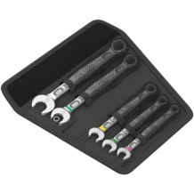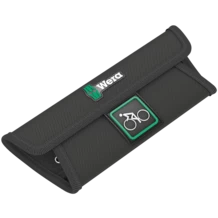 5-piece Joker 6003 spanner set; size 15 in an extra-slim design. As the working space is very narrow when working on your bike, tools are necessary that enable users to work successfully even in such situations. Narrow spaces require additional placement points of the tool. Can spanners be modified so that the placement possibilities of the tool increase? The combination of the 7.5° offset open end and the double hexagon geometry doubles the placement points. A repeated 180° turn of the wrench around the longitudinal axis during screwdriving provides four placement possibilities, and bolts or screw heads can be engaged every 15°. The Joker 6003 with its smart open end geometry significantly expands the range of uses in confined spaces. The Joker 6003 will automatically find the respective placement point after every turn. The slim yet robust ring side is tilted by 15° to the tool axis. The high-quality surface treatment achieves a high and long-lasting corrosion protection. With tool finder Take it easy: colour coding by size. The Joker pouches are suitable for attachment to walls, shelves, workshop trolleys and the Wera 2go system thanks to the hook and loop fastener system on the back.