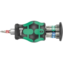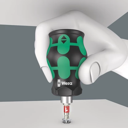 Stubby magazine for quick operations on the bike. Particularly small bit hand-holder with short bit mounting for hard to reach areas. Includes 7 stainless steel bits, 6 of which are located in a magazine in the handle and one in the bit holder. The 2-component Kraftform handle with the practical combination of hard and soft zones allows for a firm grip and precise working. Take it easy tool finder: With size stamping and colour coding by output to help you find the required bit easily.