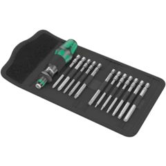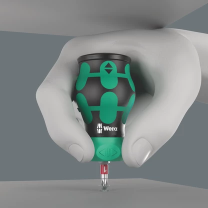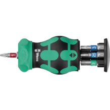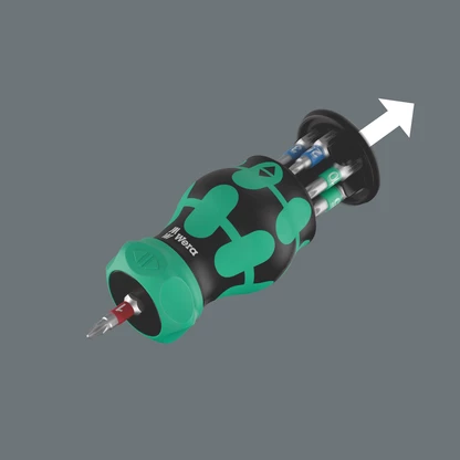 Particularly small bit holder with short bit mounting for hard-to-reach areas. The ratchet with fine toothing integrated in the handle allows fast working. Intuitive switching: If I turn the switch clockwise - the ratchet turns clockwise, if I turn the switch counterclockwise, it goes counterclockwise. Use position 0 to deactivate the ratchet mechanism for precise working. Includes 7 stainless steel bits, 6 of which are located in a magazine in the handle and one in the bitholding screwdriver. With Take it easy tool finder: with size stamping and colour coding by output to help you find the required bit easily. The strong permanent magnet in the bit mounting ensures secure holding of the bit. The 2-component Kraftform handle with the practical combination of hard and soft zones allows for a firm grip and precise working.