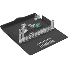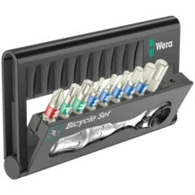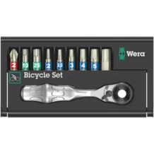 A lot of bicycle tools in a small space. The sorting of the 9 stainless steel bits by profile and size allows quick access to the right tool. With one Wera Zyklop Mini 1 bit ratchet in a drop-forged solid steel design. The fine toothing mechanism with 60 teeth allows a small return angle of 6° for precise working. The knurl allows fast screwdriving in cramped situations, when there is no space for ratcheting. Easy left/right switching. Ergonomically shaped ratchet head and lever. With Take it easy tool finder with colour coding by size - to help you find the required tool quickly and easily.