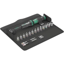 The 16-piece set from the screwdriving tool specialist Wera solves the most important screwdriving problems associated with bicycles, with reliable control of applied torque to protect sensitive components. With a click-torque wrench in the unmistakable Wera design. Very robust design with high accuracy as per DIN EN ISO 6789-1: 2017-07. Easy setting and saving of the default values. The audible and tactile snapping on reaching the scale values also facilitates the safe setting of the desired torque values. The robust release mechanism guarantees a clearly audible and tactile trigger signal when the set torque is reached. For clockwise torque-control and with a reversible 45-tooth ratchet. The torque wrench is extremely space-saving and supplemented with accessories that are suitable for the torque range and adapted to the most common screwed connections on bicycles; in a robust, surface-friendly textile box. Included are: Click Torque A 5, 1/4", 2.5 - 25 Nm, 4 sockets with 1/4" drive, 7 Hex Plus hexagon bit sockets and 4 TORX® bit sockets. Sockets and bit sockets with Take it easy tool finder with colour coding by size - for easy and quick location of the required tool. Bit sockets with holding function for extra comfortable screwdriving without the screw falling off the tool. Incredibly compact arrangement for a lot of tools in a small space. Textile box with very high robustness and longevity. Additional surface protection through the textile outer material. Low weight and volume for easier mobility. Bit sockets with all the benefits of Wera bit technology such as fitting accuracy, wear resistance and concentric run-out properties.