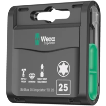 High quality bits for recessed TORX® screws in a practical Bit-Box. The Impaktor technology ensures above-average service life even under very demanding circumstances. The enhanced friction resistance from the rough diamond-particle coating on the tip of the bit prevents any slipping out of the screw head. Particularly suitable for use with customary impact drivers; 1/4" hex, appropriate for holders as per DIN ISO 1173-D 6.3. Come with Take it easy tool finder: colour coding according to profile and size stamp.