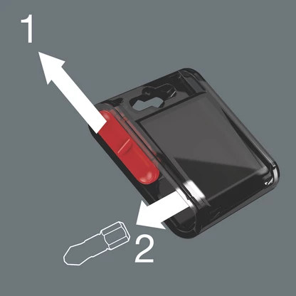 The slide switch allows a simple and gradual removal and reinsertion of the bits. The transparent reverse side means that it is easy to know how many bits are still in the box.