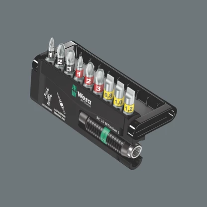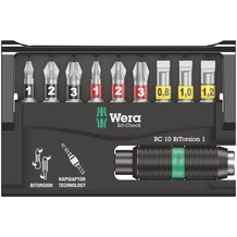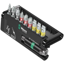 Robust Bit-Check by Wera. Bit-Checks provide a quick overview of the tools available. Bits not needed are simply reinserted into the set and do not get lost. Simple transportation e.g. in the shirt pocket. Tough viscous bits for universal use. BiTorsion bits with Torsion zone - where kinetic energy is diverted from peak loads. This greatly extends the product service life. This provides the best possible durability together with the matching holder. Comes with Rapidaptor technology, which allows bits to be attached without any need to actuate the sleeve. The removal of the bit is simple, just by pushing the sleeve forward - for rapid bit change with just one hand. For the take-up of bits with ¼" hexagon head drive as per DIN ISO 1173-C 6.3 and E 6.3. Can be inserted in the power screwdriver or for use in the chuck of the electric drill.