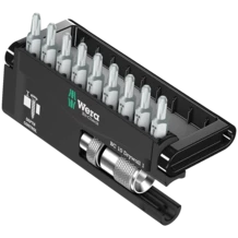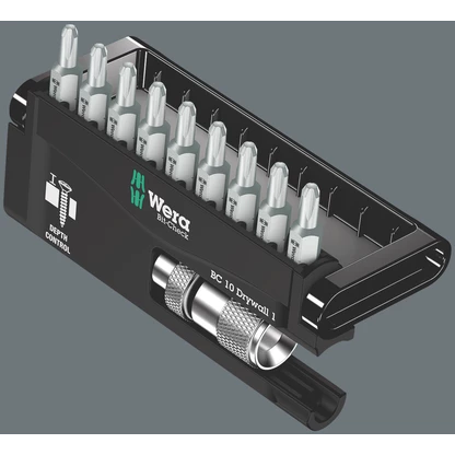Bit-Check for drywall construction. High quality spacer out of aluminium; the screwdriving depth can be infinitely adjusted and allows the flush-mounting of screws; 9 drywall bits with modified output shaft, 25 mm in length.