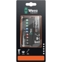 1 Impaktor holder with retaining ring and ring magnet, 9 Impaktor bits. The Impaktor technology offers an above-average service life even under extreme circumstances thanks to the best possible utilisation of the material properties and the optimised geometry; particularly suitable for use with customary impact drivers; holder with ring magnet for simple holding of longer and heavier screws, ideal for overhead work. The rough diamond-coating of the bits reduces the risk of a slipping out of the screw head thanks to the enhanced frictional resistance.