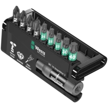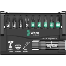 Robust Bit-Check by Wera. Bit-Checks provide a quick overview of the tools available. Bits not needed are simply reinserted into the set and do not get lost. Simple transportation e.g. in the shirt pocket. The Impaktor technology offers an above-average service life even under extreme circumstances. Enhanced friction resistance, thanks to the rough diamond-particle coating on the bit tip, prevents any slipping out of the screw head. Impakt holder for the absorption of extreme impulse peaks. Special torsion effect due to the double-torsion spring. Comes with a ring magnet that holds even long and heavy screws extremely securely, making it ideal for overhead work. The magnet can be pushed back and thereby neutralised. Particularly suitable for use with customary impact drivers.