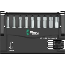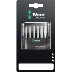 Robust Bit-Check by Wera. Bit-Checks provide a quick overview of the tools available. Bits not needed are simply reinserted into the set and do not get lost. Simple transportation e.g. in the shirt pocket. Includes universal holder with quick-release chuck. For the take-up of bits with ¼" hexagon head drive as per DIN ISO 1173-C 6.3. Can be inserted in the power screwdriver or for use in the chuck of the electric drill. Comes with tough viscous TORX® bits for universal use.
