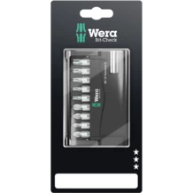 Robust Bit-Check by Wera. Bit-Checks provide a quick overview of the tools available. Bits not needed are simply reinserted into the set and do not get lost. Simple transportation e.g. in the shirt pocket. Includes universal holder with stainless sleeve, retaining ring and strong permanent magnet for the take-up of bits with ¼" hexagon head drive as per DIN ISO 1173-C 6.3. Can be inserted in the power screwdriver or for use in the chuck of the electric drill. Comes with Torsion bits to combat premature wear; tough viscous for universal use.