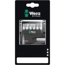 Robust Bit-Check by Wera. Bit-Checks provide a quick overview of the tools available. Bits not needed are simply reinserted into the set and do not get lost. Simple transportation e.g. in the shirt pocket. Includes universal holder with strong permanent magnet for the take-up of bits with ¼" hexagon head drive. Can be inserted in the power screwdriver or for use in the chuck of the electric drill. Multi-component Bit-Check that can be positioned upright for permanently secure bit storage.