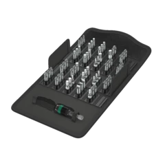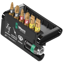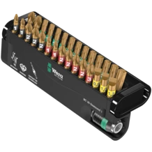 Bits with tiny diamond particles on the bit tip. This ensures a secure fit in the screw head, reduces the contact pressure required and lowers the risk of slipping. BiTorsion bits with a torsion zone - where kinetic energy is diverted from peak loads. This greatly extends the product service life. Comes with Rapidaptor technology, which allows bits to be attached without any need to actuate the sleeve. The removal of the bit is simple, just by pushing the sleeve forward - for rapid bit change with just one hand. For insertion in the power screwdriver or into the chuck of the power drill. The multi-component Bit-Check is convincing on account of its low weight and the maximum possible degree of compactness. In this respect, the soft material in the lower section of the Bit-Check ensures that the bits are securely held whilst being simple to remove at the same time. The profile and size of the bits are easy to recognise thanks to the Wera Take it easy Tool Finder with its colour coding and clearly visible imprint.