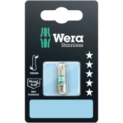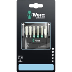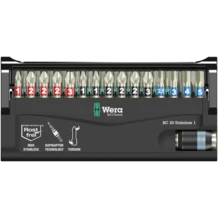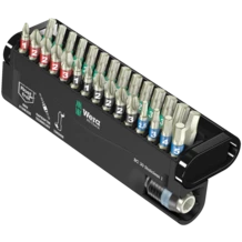 Bit-Check that can be positioned upright with high quality bits out of stainless steel. Wera stainless tools are manufactured out of stainless steel, thus preventing the formation of unsightly extraneous rust. 29 Wera stainless bits. 1 stainless Rapidaptor quick-release holder. The multi-component Bit-Check is convincing on account of its low weight and the maximum possible degree of compactness. In this respect, the soft material in the lower section of the Bit-Check ensures that the bits are securely held whilst being simple to remove at the same time. The profile and size of the bits are easy to recognise thanks to the Wera Take it easy Tool Finder with its colour coding and clearly visible imprint.