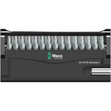 30-piece. Tough-absorbing Wera bits for universal use. 1 universal halter 899/4/1 K for take-up in the power screwdriver or use in the chuck of the power drill. Comes with tough viscous TORX® bits for universal use.