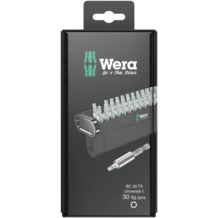 30-piece. Tough-absorbing Wera bits for universal use. 1 universal halter 899/4/1 K for take-up in the power screwdriver or use in the chuck of the power drill. Comes with tough viscous TORX® bits for universal use.