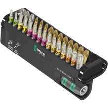 Bits and holder set, particularly suitable for woodworking. With their special geometry and as per the specification Acument Intellectual Properties, the 867/1 TORX® HF bits hold TORX® screws securely on the tool! This is particularly helpful in hard-to-reach work areas where the second hand cannot be used to hold the screw. They are also suitable for Würth ASSY screws as well as Altenloh SPAX T-STAR plus screws. With Take it easy tool finder: colour coding by size. Including universal holder with ring magnet which holds even heavy screws firmly and Rapidaptor, which allows mounting the bits without using the sleeve. The Bit-Check allows a quick overview of the available tools. Unused bits are simply put back in the holder and will not be lost. Easy transport e.g. in your shirt pocket. The Bit-Check can be set up at the work place, which allows for quick access of the tools.